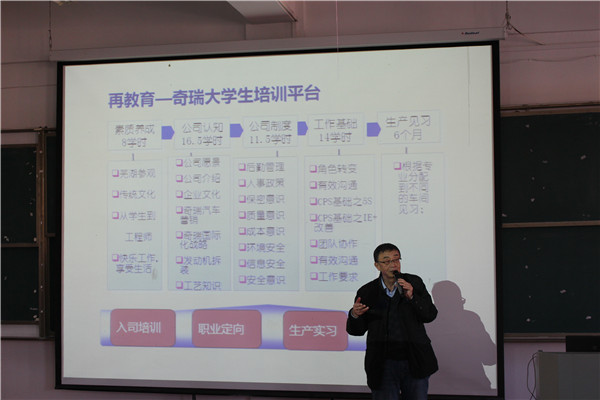赵俊泽首先结合自己在20个大型国有汽车企业生产、人事邻域,10年合资企业的HR领域、8年海外跨国公司HR和项目推进领域的工作经历,介绍了德国职业教育的优势及奇瑞企业的发展历程,着重提出汽车行业是机械专业学生从业的优选专业,而复合型人才则是经济发展的需要和工程师奋斗的方向。他强调创新意识、系统思维、可持续发展理念在市场中的重要性。