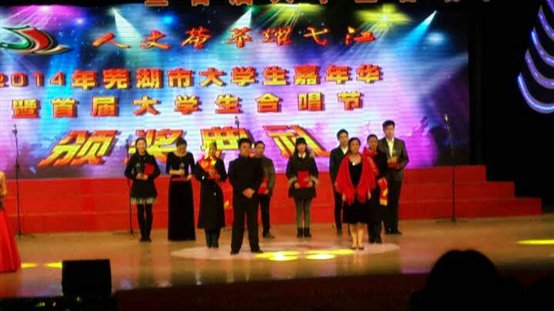 12月27日,在安师大(花津校区)大礼堂结束的 “人文荟萃耀弋江”2014年芜湖市大学生嘉年华首届合唱节上,我院大学生合唱团以《我的中国梦》和《外婆的澎湖湾》两首合唱曲目,凭借其“大气而细腻、温润而活跃、灵动而睿智”的合唱风格,赢得专家、评委老师一致肯定,以9.82的高分获得第二名的好成绩。