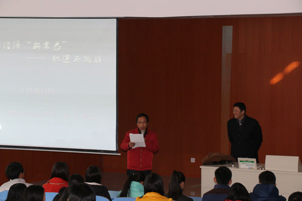 2014年12月17日下午2:30,南京大学商学院姜宁教授在我院新芜校区博雅楼W101进行了一场题为“中国经济新常态:挑战与机遇”的精彩学术讲座,出席本次讲座的有副院长胡守信,管理工程系副主任程幼明,管理工程系14级新生以及感兴趣学生,本次讲座由程幼明主持。