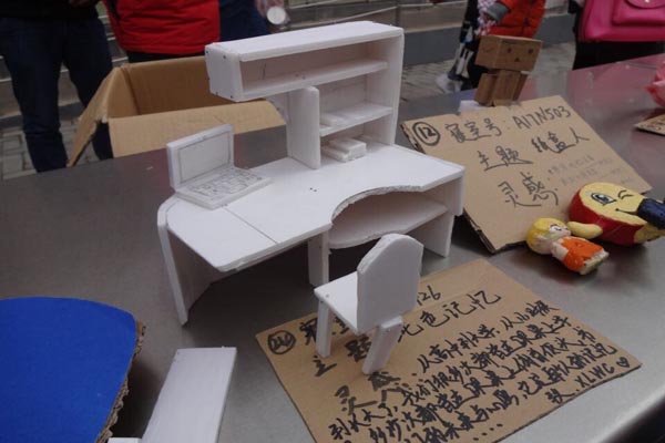 这场别开生面的活动是基础教学部学生会举办的学生环保手工玩偶作品大赛,其目的在于宣传环保思想,锻炼同学们的动手能力,培养创新性思维。本次大赛结果由现场全院师生投票选举产生,作品以寝室为单位制作完成。在现场,每一位创作者都积极地向观众介绍自己作品的主题和灵感来源:公主晚礼服、维京狂战士、日本武士刀、骑迹自行车、圣诞不倒翁等等。每件作品的背后都寄托着一份感情,都隐藏着一个梦想。选手们饱含激情的介绍令观众们非常感动,纷纷写下自己赞赏的作品编号进行投票。