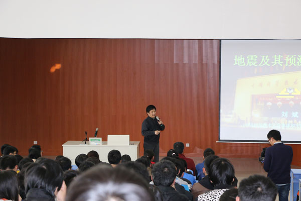 刘斌首先通过相关事例,向我们说明了地震是一场严重的自然灾害,给我们带来了深重的灾难,并借此向广大学生分析越来越多人关注地震的原因。随后,刘斌就地震相关的概念给予了详细地讲解,如:何为纵波和横波,震中位置与震源深度以及震级等之间的关系。最后,刘斌就地震的活动特点与一般性规律、地震的成因以及地震预测的基本目标等方面向在座学生作了说明。