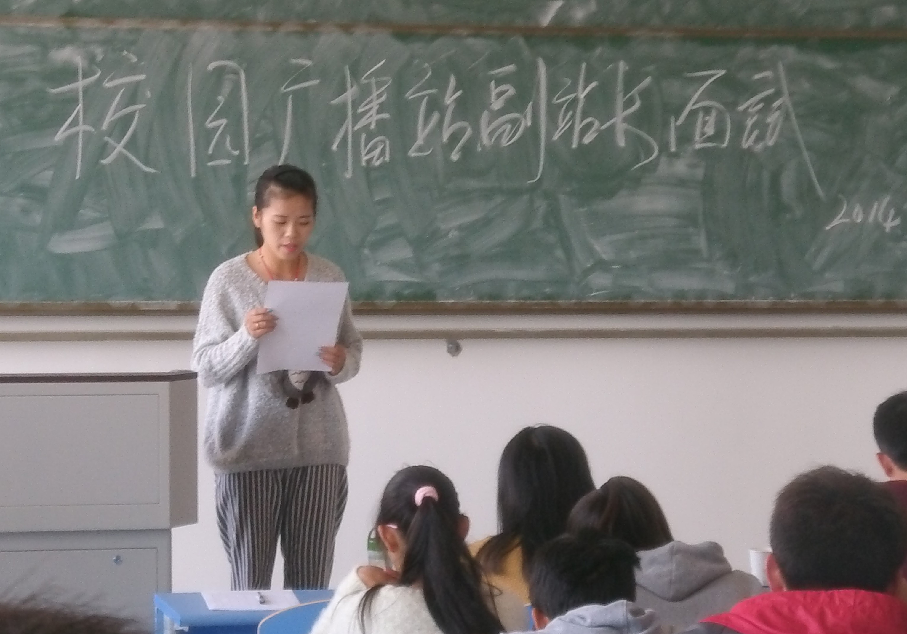 10月15日下午,安徽工程大学机电学院大学生广播站在新芜校区A1N402、A1N404教室进行了2014年招新面试工作。广播站站长张慧、新芜校区广播站负责人韦鹏飞担任评委。经过面试,14位大一新生凭借自己对播音、编辑的热爱,积极的态度和扎实的文化功底,脱颖而出。(胡胜男/文、摄)