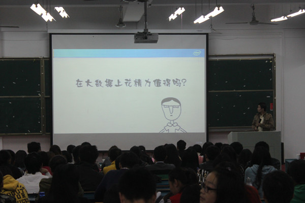 桂博士主要从一场生活、工作与思维的大变革,大数据时代的思维变革,大数据时代的商业变革,大数据时代的管理变革以及生活中的大数据案例探讨五个方面阐述大数据下所发生的变革及影响。首先,通过一段视频,桂博士向同学们介绍了大数据的概念及特点。谈论到生活、工作与思维变革时,桂博士通过举例,说明在平时生活与工作中要注意变换思维,不能一味追求精确性,也要看到混杂性。同时,也不能仅仅追求传统的因果性而忽略相关性。接着,谈论到商业变革,通过举例,桂博士向同学们说明了文字、方位、沟通以及世间万物的数据皆可量化,通过取之不尽用之不竭的数据创新,可以获得数据的真实价值及信息。紧接着,桂博士又向同学们展示了以数据分析技术公司为主的管理变革形式,通过大数据时代的风险,说明数据可以主宰一切隐忧,实现责任与自由并举。接下来,桂博士进行案例探讨,阐述了大数据方案价值的体现以及在电商中的价值,为大数据下的企业营销决策提供了应用方案。生动形象的举例贯穿整个讲座,贴近生活,贴近现实,引起了同学们强烈的兴趣和共鸣。