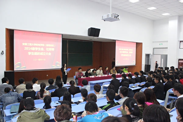 10月29日13:30,随着庄严的国歌,安徽工程大学机电学院新芜校区A2E01教室召开了学生会、社联、新闻中心等学生组织成立大会。副院长许晓菁,学生处副处长黄武勇,学生处思想教育科科长谢贵勇,大学生艺术团指导老师王甜,大学生社联指导老师丛剑秋,广播站指导老师吕海涛,新闻中心指导老师赵靓,轻风心理社指导老师周靖雯出席本次大会。大会由从剑秋主持。