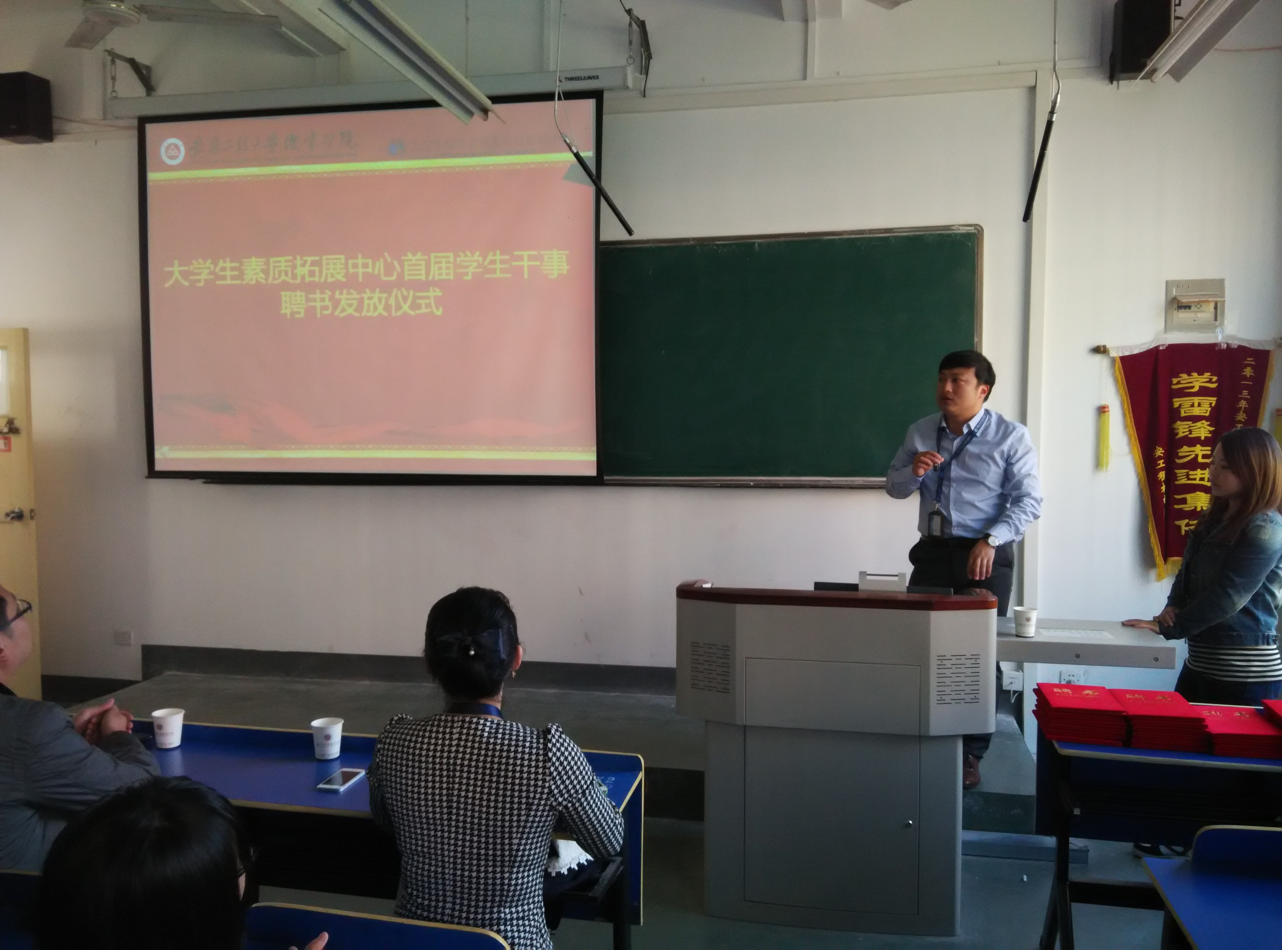 10月15日下午,我院大学生综合教育与素质拓展中心在文津校区西二102教室隆重举行学生干事聘书发放仪式。素质拓展中心张宣老师,尹伟老师,洪杰老师以及王蕾老师出席参加,仪式由综合管理部许凤玲同学主持。