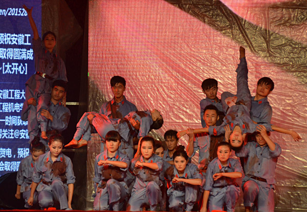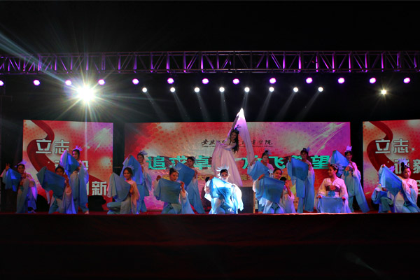 古色古香的舞蹈《洛神赋》,长袖飘飘,翩若惊鸿,倩影顾盼,婉若游龙,光影叠错,巫山萦梦,众星拱月,凤凰来仪。陈王香枕会神女,几多相思洛神赋?劲爆的街舞描述了一群舞痴对舞蹈的热爱:受伤,他们早已习以为常;彷徨,他们不会选择投降; 努力,他们永远都不会忘; 失败,他们便会更加坚强。青年教师的歌曲串烧同样博得了新生们的喝彩,充分展现出我院教师是多才多艺能歌善舞的全能人才。变幻莫测的魔术成为奇迹一刻的见证。14级新生也不甘落后献上《光绘》,用光描绘人生,照亮他人。舞台剧红色经典《长征》悲壮豪迈,为观众们展示了那一段可歌可泣的历史,当鲜红的血染红了红军战士的军装,当战友怀抱奄奄一息的战友,观众们被感动了,长征的精神在这里。集体舞《开门红》进行的同时,学院的上空烟花齐放成为亮点,灿烂的烟花仿佛欲与天公试比高。