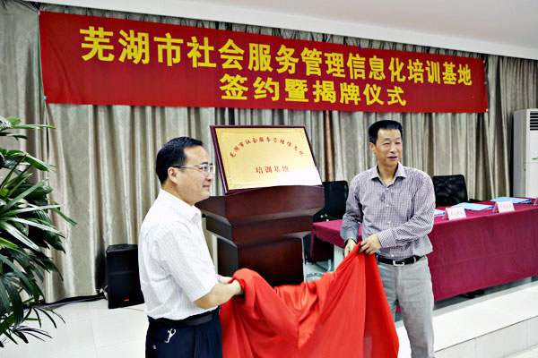 吴敏、董萍、周晓梅、承孝敏在与会人员的见证下,签订了芜湖市社会服务管理信息化培训基地四方协议。张峰、吴敏为四方共建芜湖市社会服务管理信息化培训基地揭牌。
