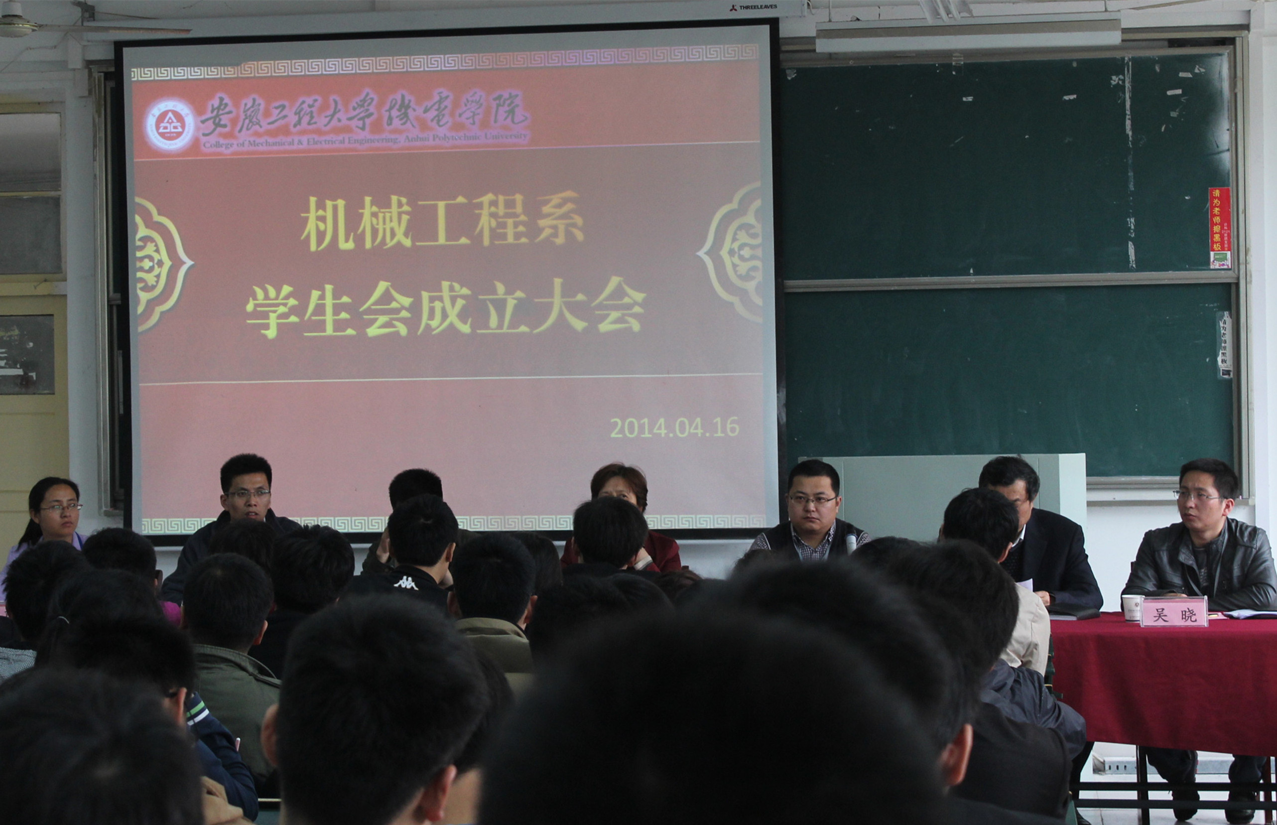 2014年4月16日下午13时,机械工程系举行了第一届系学生会成立大会,并邀请了学院副院长许晓菁,学生处副处长黄武勇,学生处思想教育科科长谢贵勇,学生管理科科长孙惠玲参加会议。机械工程系常务副主任魏泽峰、副主任柴阜桐、学工秘书吴晓,全体辅导员、教师与第一届学生会全体成员及学生代表共100余人参加了大会。柴阜桐主持大会并宣读了机械工程系第一届学生会录用名单。