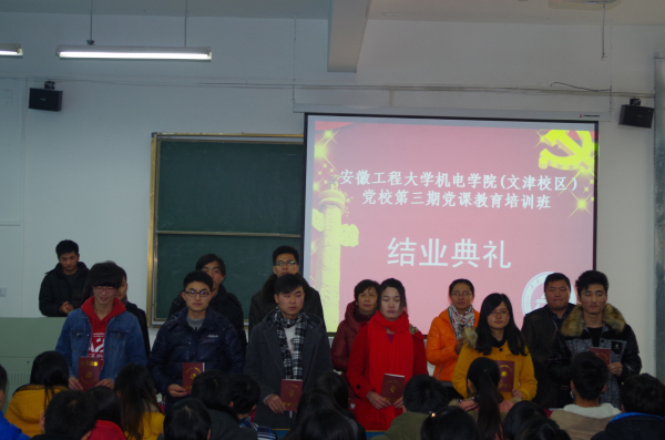 12月25日安徽工程大学机电学院党校第三期党课教育培训班结业典礼在西二501举行。我院副院长许晓菁,学生党支部书记陈振,学生处思想教育科科长谢贵勇,学生管理科科长孙惠玲以及本期党课教育培训班班主任韩海东、樊钒与本期培训班150余名学员一起参加了典礼,陈振主持了会议。