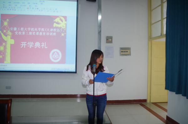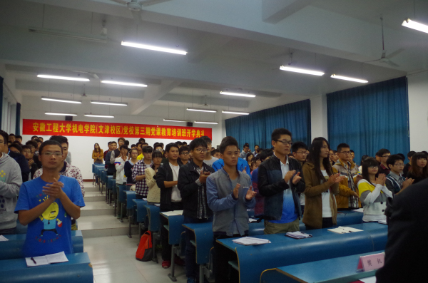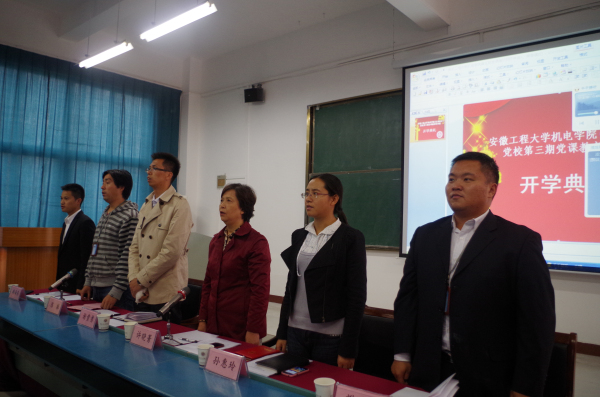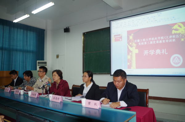 2013年10月16日下午,安徽工程大学机电学院第三期党课教育培训班开学典礼于文津校区西二501教室隆重举行。学院副院长许晓菁,学生处思想教育科科长谢贵勇,学生管理科科长孙惠玲以及本次党课培训班12级班主任韩海东、13级班主任樊钒老师出席了典礼,陈振老师担任主持人。162名学员参加了此次典礼。