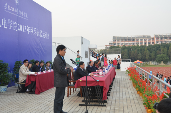 安徽工程大学机电学院2013年秋季田径运动会闭幕式于10月26日在文津校区操场举行。学院副院长王彬、胡守信、许晓菁,院长助理兼办公室主任董飞,教务处副处长汪忠国、学生处副处长黄武勇及各系部、处室主要负责人出席了闭幕式,董飞担任主持。我院全体师生及各系部运动员代表参加了本次闭幕式。