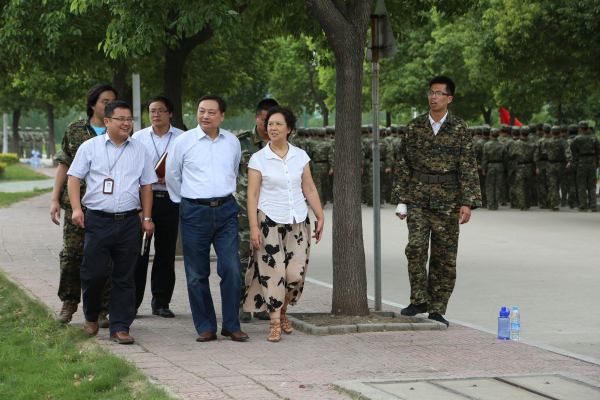 9月23日上午,院长干洪、副院长许晓菁在军训团团长徐浩,政委、学生处副处长黄武勇的陪同下,来到文津校区军训场地,亲切看望了正在军训的2013级新生以及参训教官。
