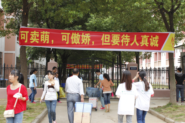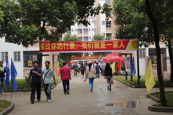 为方便新生报到,学院在火车站、汽车站安排了志愿者,帮助可爱的学弟学妹们找到“回家”的路。一座巨大的彩虹门,一条醒目的标语“欢迎新同学,绚丽人生从此起步,精彩未来在这里打造”是欢迎新同学的第一道风景。中央广场上插满了鲜艳的旗帜,还有温馨醒目的横幅。各专业报到点的帐篷沿广场四周呈扇形依次排开。广场中央的喷泉更增添了不少欢乐的气氛。穿过校园的林荫小道,走到男生宿舍区时,一条横幅“你终于回来啦,宿管阿姨想你呀”着实让我们心里一暖,而挂在女生宿舍的横幅—— “做一个明媚的女子,不倾国、不倾城,以优雅地姿态去摸爬滚打”的标语则给人耳目一新的感觉,同时也给新生们带来了家的气息,让他们忘却了初到异乡的不适。