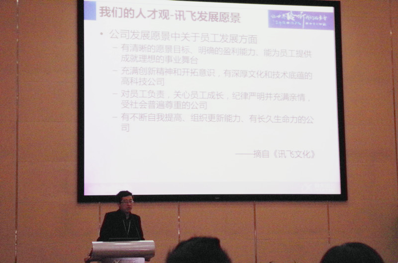 李志宁在演讲中还强调了科大讯飞的人才观、价值观与吸引力。李志宁阐述了公司的人才培养理念——“成就员工梦想,创造社会价值”,表示公司愿为员工提供与其贡献相匹配的丰厚回报和持续的培训成长空间。是科大讯飞的管理理念,他表示,科大讯飞凭借其“真诚、平等、自律、分享”的管理理念为员工提供施展才华的舞台和建立简单真诚的人际关系。在描述“展翼行动—百炼工程—提高管理技能”等IFLY工程时,李志宁重点介绍了讯飞直通车中的人才培养模式,包括课程定制、项目模拟、导师指导三个环节中的具体内容。