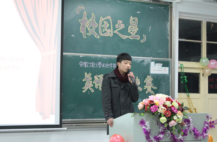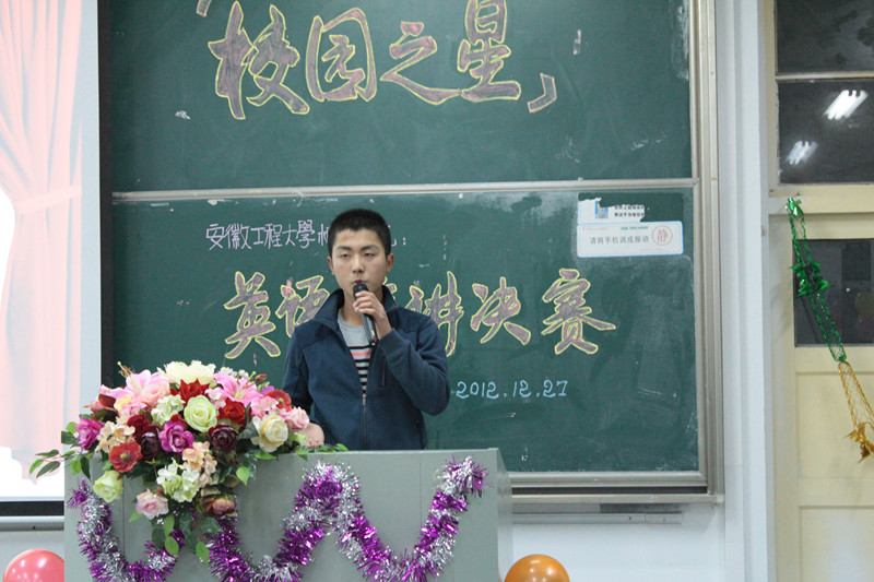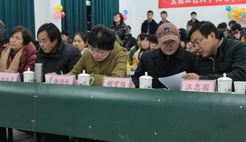 为提高我院学生的英语口语水平,丰富同学们的校园文化生活,加强我院学风建设,2012年12月27日晚,我院文津校区首届“校园之星”英语演讲比赛决赛在西三教学楼301教室拉开帷幕。我院特邀安徽工程大学外国语学院金成星副院长,安徽师范大学硕士生导师谢劲秋博士担任此次决赛评审组组长。我院文津校区副院长胡守信、许晓菁,教务处副处长汪忠国,基础教学部副主任郭大伟,以及基础教学部胡叶婷、孙立老师担任决赛评委。