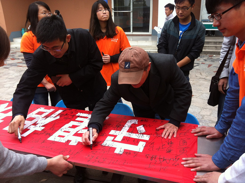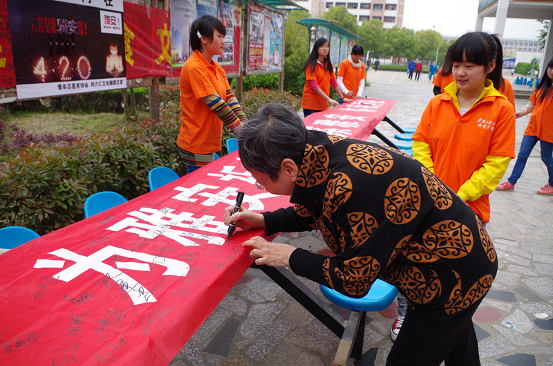 2013年4月22日上午11时,在安徽工程大学机电学院文津校区的校园里,多名师生参加了由院青年志愿者协会组织的为4.20地震灾区人民祈福的签名活动,希望能够用这种方式表达对四川雅安人民的祝福与关心。
