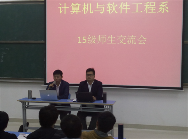为深入了解2015级新生入校后的思想状况和学习状态,加强师生间的交流和沟通,更好地开展各项学生工作,10月29日中午12:45和晚上7:00,计算机与软件工程系在A1S103教室连续召开了两场师生交流会。计算机与软件工程系教研室主任雷大正、双师殷振华和新芜校区学生代表参加了此次交流会。