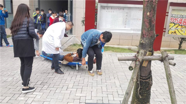 (校卫队队员从教学楼中抬出“受伤”学生)