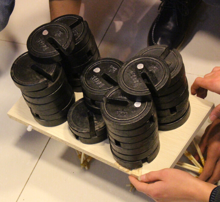 比赛开始前,主持人宣读比赛规则以及评分细则。比赛过程中,各组选手集思广益,充分展现了团队的协作能力和集体智慧。在短短一小时内,各参赛组均完成了自己的作品,制作了形状各异的“筷子桥”,其中有拱桥、斜拉引桥等。制作结束后,比赛进入选手现场阐释和作品验证环节。首先由参赛选手分别向评委讲阐释作品制作的力学原理,紧接着进入到以“筷子桥”的负重、桥体性能稳固为主的承重试验环节。选手们小心翼翼地将砝码叠加在“桥”上,随着砝码的增加,现场就会响起一片掌声与欢呼声。当“桥梁”达到负重极限而坍塌时,现场又会听到一片叹息之声并伴随着更为热烈的掌声。很快,负重位居前9位的“筷子桥”脱颖而出。评委又根据这9座筷子桥的外观造型和设计结构,评选出了一、二、三等奖。最终,车辆1501班“梦之筷队”以总分40.2分夺得本次比赛冠军。孙瑞麟老师为参赛作品进行了点评,给现场同学上了一节生动的力学及“结构设计”课程。
