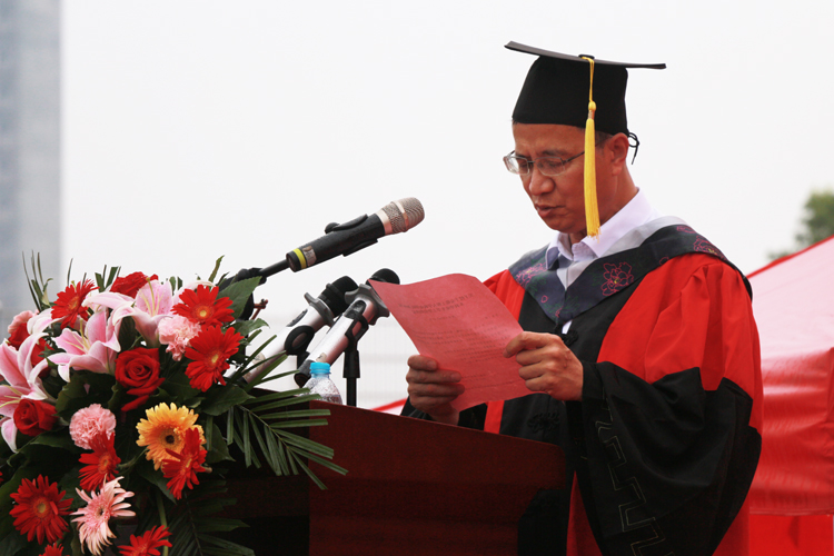 接着,副院长陈跃东宣读了学院《关于授予2016届毕业生学士学位的决定》。在欢快的乐曲声中,院学位委员会委员为获得学士学位的毕业生代表颁发学位证书并扶正学士帽上的流苏。