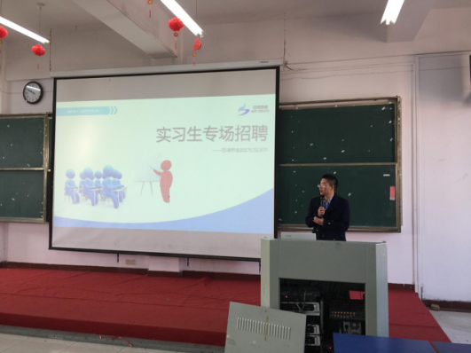 本网讯 为使学生了解和参与企业的实际生产和项目实践活动、培养学生理论联系实际的能力、加深对专业理论知识的理解和应用,12月15日,计算机与软件工程系邀请安徽百得思维信息科技股份有限公司(以下简称“百得思维”)在我院文津校区西二503开展2016年首次实习招聘宣讲会。百得思维人力资源部经理黄洪标主讲。
