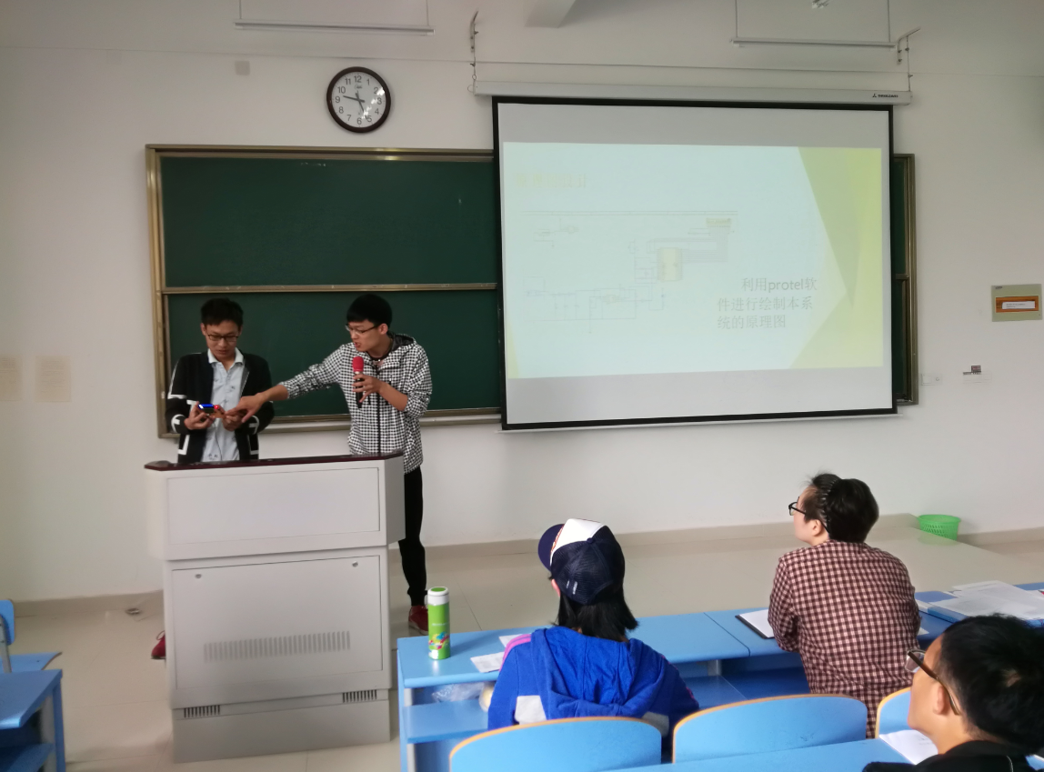 本网讯 5月24日上午,机械工程系14级测控技术与仪器专业三个班完成了为期4周的专业实训,在新芜校区A1S205教室进行实训成果答辩。此次实训环节围绕单片机实际应用项目开展设计与制作,学生根据不同的项目课题进行分组,形成3-4人的团队小组,合作完成实训课题任务,通过系统protel/DXP电路原理图设计、proteus软件程序仿真、硬件选型和参数确定,最终完成实物焊接、调试及制作。