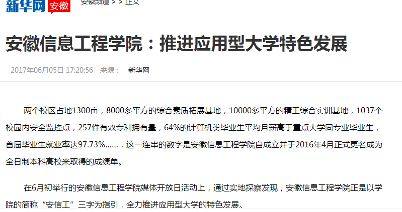 新华网 2017年6月5日 安徽信息工程学院:推进应用型大学特色发展
