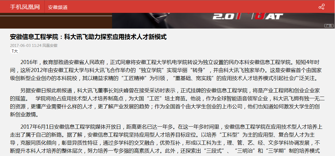 凤凰网安徽频道 2017年6月3日 安徽信息工程学院:科大讯飞助力探索应用技术人才新模式
