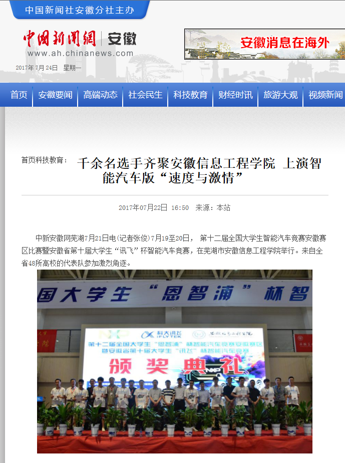 中新安徽网芜湖7月21日电(记者张俊)7月19至20日,第十二届全国大学生智能汽车竞赛安徽赛区比赛暨安徽省第十届大学生“讯飞”杯智能汽车竞赛,在芜湖市安徽信息工程学院举行。来自全省48所高校的代表队参加激烈角逐。