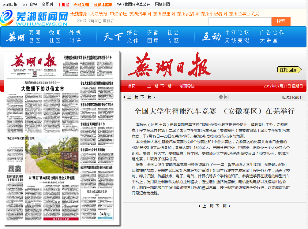 芜湖日报 2017年7月23日 全国大学生智能汽车竞赛 (安徽赛区)在芜举行