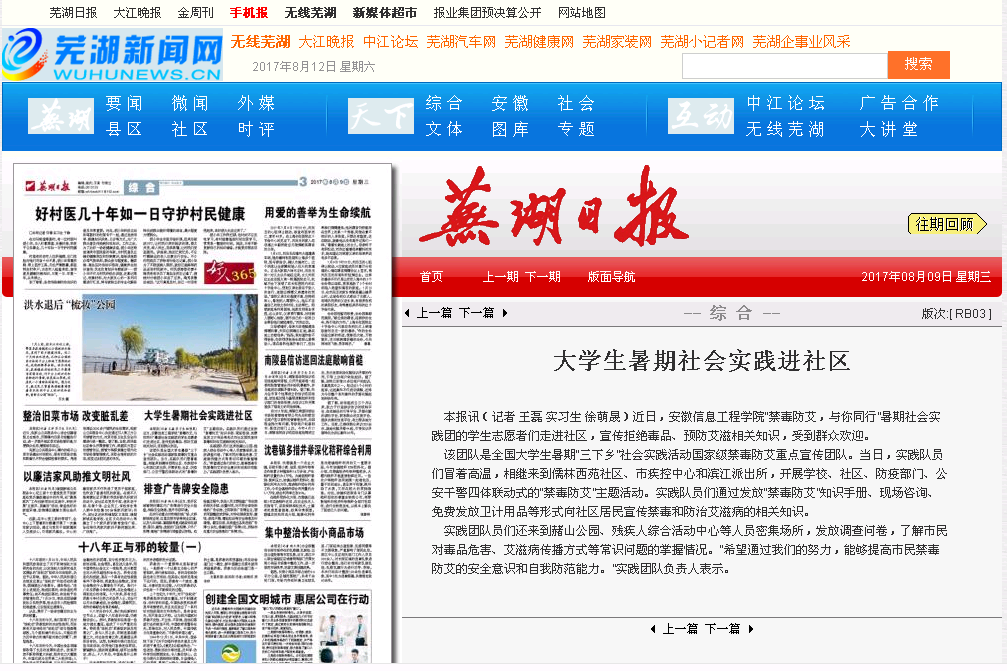2017年8月9日 芜湖日报 三版 大学生暑期社会实践进社区