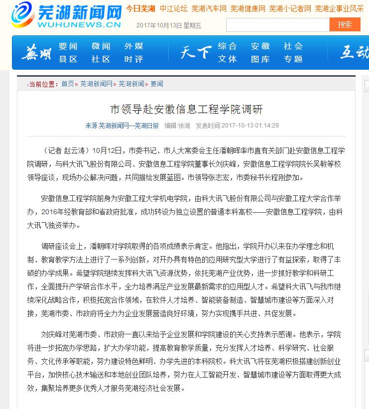 调研座谈会上,潘朝晖对学院取得的各项成绩表示肯定。他指出,学院开办以来在办学理念和机制、教育教学方法上进行了一系列创新,对开办具有特色的应用研究型大学进行了有益探索,取得了丰硕的办学成果。希望学院继续发挥科大讯飞资源优势,依托芜湖产业优势,进一步抓好教学和科研工作,全面提升产学研合作水平,全力培养满足产业发展最新需求的应用型人才。希望科大讯飞与我市继续深化战略合作,积极拓宽合作领域,在软件人才培养、智能装备制造、智慧城市建设等方面深入对接,芜湖市委、市政府将全力为企业发展营造良好环境,努力实现携手共进、共促发展。