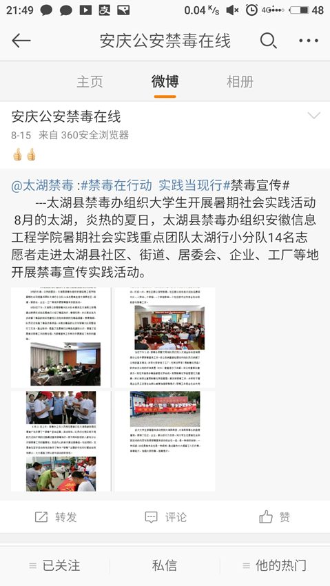 安庆公安禁毒在线微博相关报道