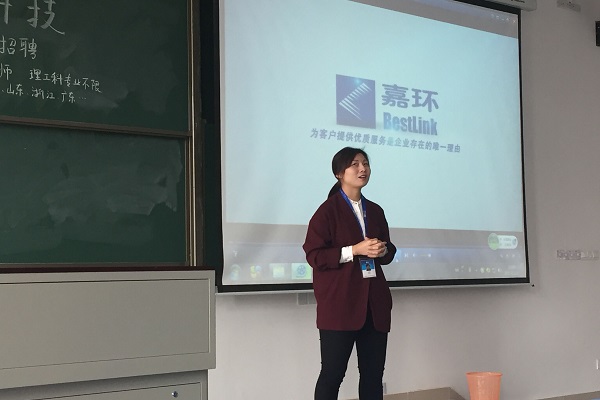 本网讯 我系于2017年11月15日下午一点在新芜校区A3W101教室举行了一场由嘉环科技资源配置经理张维娜女士主持的专场招聘会。招聘会分为三个环节:公司介绍、现场答疑和现场面试。