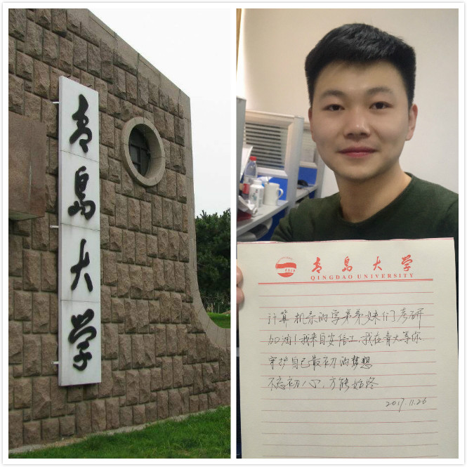 胡欢,原软件5班及嵌入式1班的学生,考上了青岛大学的研究生,对学弟学妹他说:“考研,时间越来越紧了,是否疲惫了,是否耐不住性子了,是否紧张了,不要怕,你还有我们,还有学院,还有母校为你护航。放下心里的包袱,想想自己的坚持是为了什么。不要过度的熬夜看书了,调节好作息,给身体充充电。别太担心结果,努力是会有收获的,平常心、开心点、睡好吃好,你们一定行。不忘初心,方能始终。”特别同意他说的那句话“不忘初心,方能始终”,坚持自己的初心,方能成功。