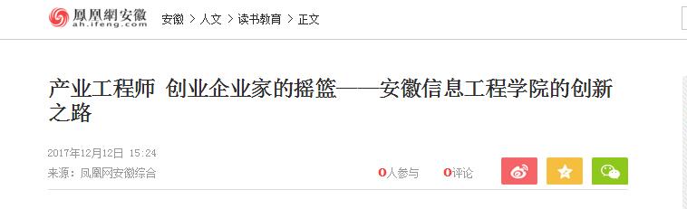 凤凰网安徽 2017年12月12日 产业工程师 创业企业家的摇篮——安徽信息工程学院的创新之路
