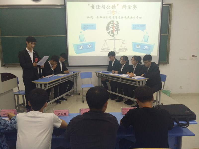 为帮助学生更好地理解并践行大学生综合素质养成计划,本着“提升思辨能力,丰富课外生活,激发自主思考能力”的宗旨,2018年5月3日,安徽信息工程学院机械工程学院学生会举行以“公德与责任”为论题的辩论赛决赛,就“公众人物是否应该承担更大的责任”展开讨论。此次比赛邀请了我校辩论协会的优秀队员担任评委,现场气氛紧张热烈,双方辩手你来我往、互不相让,场下观众热情参与、掌声不断,互动环节更是引爆全场。随后的自由辩论环节将比赛气氛再次推向高潮,各队伍气势如虹,时而妙语连珠、诙谐幽默,时而慷慨激昂、掷地有声,整场辩论精彩绝伦、欢呼不断。经过4场激烈较量,最终决出一二三等奖,本次辩论赛在同学们热烈的掌声中圆满落下帷幕。 (选手激烈辩论,裁判认真听辩)( (现场唇枪舌战,互不相让) (主持人汇报比赛结果)“唇枪舌战,辩赛场硝烟;口若