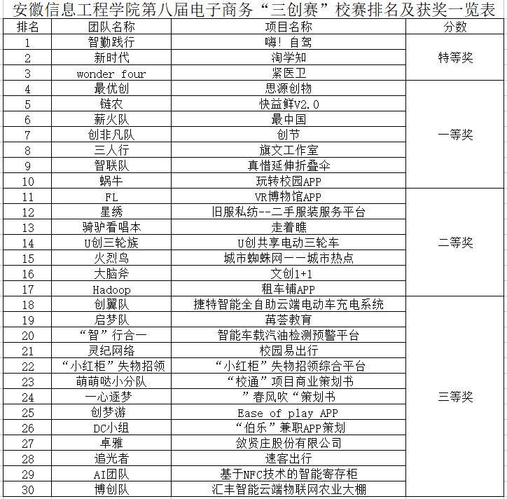 2018年4月27日下午,由安徽信息工程学院教务处主办,管理工程学院承办的第八届全国大学生电子商务“创新、创意及创业”挑战赛校内选拔赛在新芜校区A1W101顺利举行。 本次大赛我校共有超过130团队报名注册,经过筛选有十七支团队进入最后的校内选拔赛。此次比赛分为选手PPT演示和评委点评讲解两个部分,参与比赛的十七支队伍根据自己的项目制作了精美的PPT,从项目简介、市场分析、战略规划、营销推广、财务分析等几个方面予以阐述,选手们对评委老师们提出的疑问进行了答辩,评委老师们根据选手们的表现做了细致的点评和指导,同时也针对选手们在讲演各自策划案过程中的不足之处提出了建议。经过三个多小时的激烈角逐,比赛取得了圆满成功。共决出了三个特等奖、七个一等奖、七个二等奖和若干三等奖。名单如下:管理工程学院将会根据省组委会下发的名额推荐一定数量的团队进入省赛。希望各位同学为后面的省赛做准备,也祝愿他们在省赛中取得优异的成绩。 (评委老师认真打分) (观众认真聆听) (参赛选手进行PPT展示) (选