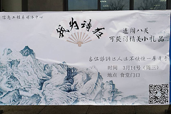 信息工程系媒体中心主办的“我为诗狂”诗词主题活动于2018年3月14日在食堂门口顺利举办。(我为诗狂活动海报)本次活动吸引了一大批热爱诗词的同学踊跃参加,活动以户外互动有奖答题的比赛形式进行,新颖有趣的比赛...