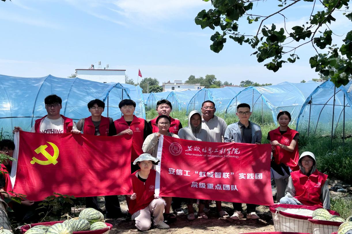 为深入学习贯彻党的二十大精神,提升青年学生的综合素质,鼓励他们积极参与社会实践,2024年7月25日-8月7日,由计算机与软件工程学院(大数据与人工智能学院)网络工程2201班级成员组成的安信工“虹城智联”实践团在指导老师韩慧慧、张玲和思政指导老师张田祥的带领下,走进安徽省蚌埠市五河县开展大学生“三下乡”暑期社会实践活动。盛夏瓜香满园飘,调研走访丰收景7月26日,安信工“虹城智联”实践团来到安徽省蚌埠市五河县双庙镇西瓜园走访调研。当地瓜农向成员介绍道:“西瓜的整个种植过程采用无公害栽培技术,既保证了西瓜的天然健康,又保护了环境。从播种到成熟,每一个阶段都凝聚了瓜农们的无数心血与汗水。”同时通过拍摄、录制和剪辑视频,并在网络平台等渠道发布的形式宣传,让更多人了解西瓜的种植和采摘过程,了解庙镇西瓜园的甜美西瓜。谈及西瓜的收成时,瓜农的脸上洋溢着自豪与满足的笑容。他告诉实践团成员,今年的西瓜长势尤为喜人,预计产量比往年有显著提升。这不仅仅是对瓜农辛勤付出的最好回报,更是对他们智慧和坚持的肯定。