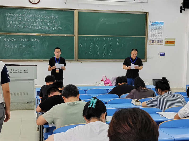 本网讯 为强化学生基础能力培养,实现课程教学与第二课堂科技创新活动的目标对齐、内容融合和考评接轨,2023年9月16日教务处组织开展首届高等数学水平测试赛,本次测试赛面向开设高等数学课程的2022级所有学生,共有3138人,涉及全校5个学院,19个专业,合计69个考场。本次高等数学水平测试赛,是学校C2022版本科专业人才培养方案全面推进“以赛促学”教学改革的重要举措。为做好本次测试赛的各项工作,教务处在春季学期期末发布《关于举办安徽信息工程学院首届高等数学水平测试赛的通知》,并通过公众号推送关于数学水平测试赛赛事资讯,明确测试对象、考核测试范围以及成绩的相关应用等。学校高度重视本次测试赛的相关工作,考前通识教育与外国语学院数学教研室利用暑假时间精心制作了相关知识点的视频录播资源供学生复习备赛,并按照国家级考试标准要求各个考务环节,不松懈不马虎。(赛事宣贯)测试赛期间,分管教学校长孙辉,通识教育与外国语学院执行院长刘德胜,教务处与教育质量与评估办公室,组织赛事巡视组,全程跟踪竞赛情况。比