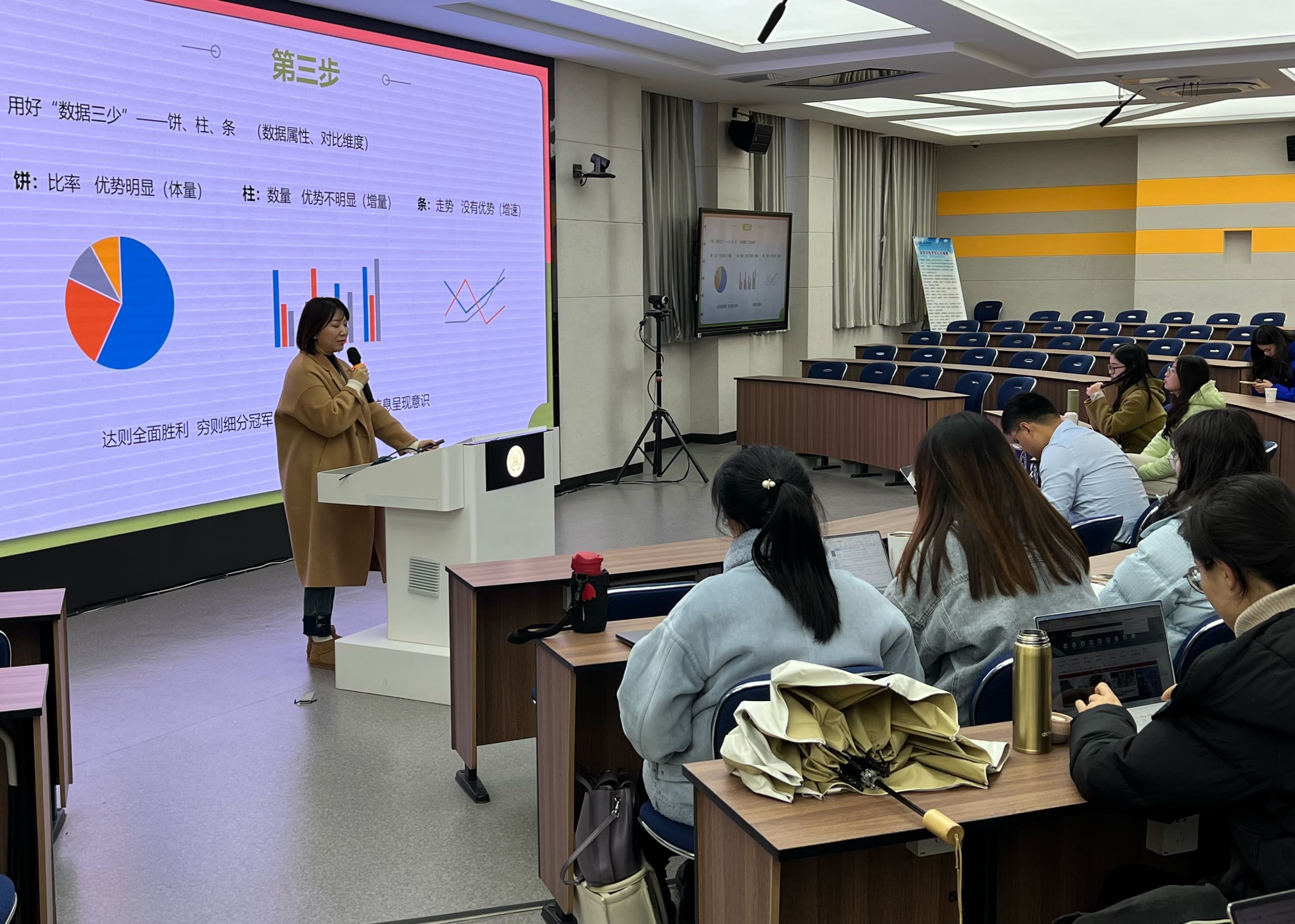 本网讯 随着青年教师的增加以及社会的进步,提高教师的教学能力与工作能力变得尤其重要,为了进一步提升教学课件制播的工作水平与工作效率 ,2022年11月30日15:15,由通识教育与外国语学院承办的“PPT制作的进阶之路”主题讲座在A3博学楼W301举行,本次讲座特邀教务处李兰老师担任主讲人,李兰老师具备丰富的PPT经验,部分青年教师到场参加,在此共同学习如何提高PPT制作水平。培训现场李兰主讲ppt制作方法首先,李兰老师向大家抛出“怎样才算好的PPT”问题,并阐释让自己满意与让受众满意才算好的PPT是怎样的,接着就“如何解决做到双方满意”展开谈论。随后,李兰老师将本次讲座分为五个部分:一、了解主题,掌握汇报要求;二、梳理设计思路,确定框架;三、筛选素材,归纳整理;四、制作PPT;五、做好检查,避免错误,进行讲演。第一部分:了解主题,掌握汇报要求,将其重点指在考虑主题、时长、场景,谁演讲、谁在听方面;第二部分:梳理设计思路,确定框架,李兰老师通过三个逻辑与三个视角进行分别讲解;第三部分:筛