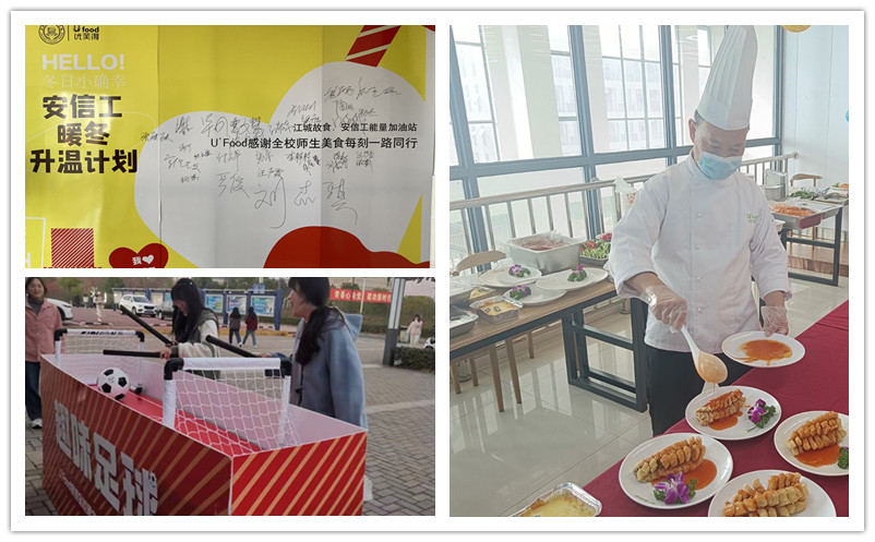 本网讯 随着立冬节气的到来,气温明显有所下降,为丰富校园文化生活,培养健康饮食观念,11月24日,后勤管理处组织学校各大食堂开启暖冬升温计划,感受温情与美味相融。活动现场,多种美食主题如约而至,烤全羊、松鼠鱼、烘焙点心、各色炒菜等多种特色美食呈现在展台上,学生们可以通过桌面足球赢取奖券免费品尝美食,欢快的节奏瞬间将气氛推向高潮,前来品尝美食和观看的师生们络绎不绝。(活动现场)(各种美食)立冬已至,寒意渐浓,心安暖,幸福至。此次活动不仅展示了丰富的美食和餐厅工作人员的卓越厨艺,还表现了独具风格的信工美食文化,让广大师生在欢乐的氛围中乐享美食。后期后勤管理处在确保食品卫生安全的基础上,将积极组织开展多项食堂暖冬活动,暖心暖胃,用心服务,情暖师生。