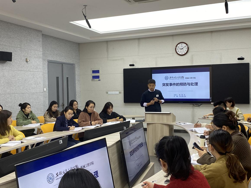 10月27日上午9:00,在A3(博学楼)S406举办辅导员工作坊第二期活动:学生突发事件的预防与处理专题培训,本次培训由机械工程学院韩海东老师主讲,全体2021年、2022年入职辅导员参加了培训。(图为韩海东老师培训现场)韩海东老师从自身处理过的学生突发事件实例出发,总结凝练了学生突发事件的类型、诱因、处理流程及方式,在此基础上结合具体案例的辩证分析,引发参会老师的思考与讨论。他强调,辅导员在日常的工作中要多关注“六特”学生群体,深入到学生之中,了解他们的学习生活情况、思想状况,把握当代大学生的思想特性,努力将危机事件的诱因化解在萌芽之中。讲座最后,在场辅导员积极探讨,他们认为辅导员的工作需要将职业化、专业化和艺术化结合起来,多层次、多维度地深入到学生当中去,采用艺术的语言与方法处理学生日常管理事务,不断提高辅导员的工作能力与水平。