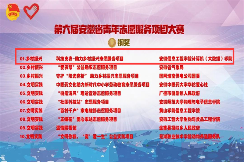 本网讯 为深入贯彻落实习近平新时代中国特色社会主义思想,大力培育和践行社会主义核心价值观,以实际行动贯彻落实习近平总书记对志愿服务工作的重要指示精神。近日,由团省委、省文明办、省民政厅、省水利厅、省文化和旅游厅、省卫生健康委、省退役军人事务厅、省总工会、省残联联合举办的“志愿新时代,共筑中国梦”第六届安徽省青年志愿服务项目大赛决赛暨志愿服务交流会”在合肥市举办。我校计算机(大数据)学院“科技助农-助力乡村振兴志愿服务项目、AI助力乡村振兴”2个项目从全省600多个志愿服务项目中入围现场赛,经过激烈比拼,“科技助农-助力乡村振兴志愿服务项目”最终荣获铜奖。(图为大赛获奖名单)(图为“科技支农-助力乡村振兴志愿服务项目”负责人参会)“科技助农-助力乡村振兴志愿服务项目”主要围绕解决农村产业振兴问题,关注农业、走进农村、服务农民,多年来到淮北市、芜湖市等地,以科技下乡、科学助农、科普教育“三科”为主要内容,充分发挥学科专业优势,实现志愿服务由“单向动员”向“双向互动”,打造志愿服务“项目化、社