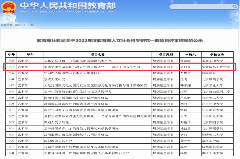 近日,教育部社科司对2022年度教育部人文社会科学研究一般项目评审结果进行公示,其中,规划基金、青年基金、自筹经费项目共2617项通过专家评审;西部和边疆地区项目165项,新疆项目19项,西藏项目1项通过专家评审。中国特色社会主义理论体系研究专项30项,高校辅导员研究专项208项通过专家评审。安徽信息工程学院2项课题获批立项,其中艺术学规划基金项目1项,艺术学青年基金项目1项。这是我校自转设以来获批的首个教育部人文社科规划和青年基金项目。艺术设计学院视觉传达教研室教师夏月曼申报的《非遗文化在动态图形设计中的价值研究——以二十四节气为例》获得教育部人文社科规划基金项目立项,获批经费10万元,艺术设计学院产品设计教研室教师薛遥申报的《汽车人机交互界面的适老化设计研究》获得教育部人文社科青年基金项目立项,获批经费8万元。(图为评审结果公示) 教育部人文社会科学研究项目是教育部面向全国普通高等学校设立的人文社会科学研究项目,其覆盖面广、影响大,具有重要的示范和引导作用,历来是各高校竞争和关注的焦