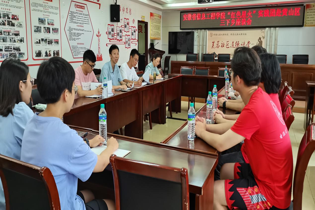 为积极响应全国大学生暑期“三下乡”社会实践号召,引领广大青年学生扎根基层、传承红色基因、放飞青春梦想、承担青年学子的社会担当。2022年7月2日至7月16日,安徽信息工程学院“红色星火”实践团在指导老师张琳琳和苏婷婷的带领下前往黄山市黄山区甘棠镇,展开为期14天的暑假三下乡实践活动深入基层对接,助力乡村振兴社区虽小,却连着千家万户。社区基层工作者也是重肩在任,始终将人民放在心中最高的位置。“红色星火”实践团于7月3日在指导老师苏婷婷的带领下前往芙蓉社区进行对接仪式,成员们在崔书记的带领下了解社区工作日常及主要开展的志愿服务项目。最后,双方商定了活动行程与安排,将社区活动与实践活动相结合,共促发展。此次对接活动使实践团成员们切身感知基层真实需求及新时代对大学生素质与能力的要求,表示定会不虚此行,脚踏实地,将所学习的专业知识转化为实践力量。(图为对接会议现场)踏寻革命足迹,传承红色血脉红色文化是连接过去、现在和未来的重要精神纽带。7月4日—7月7日,红色星火实践团前往位于安徽省黄山市黄山区谭