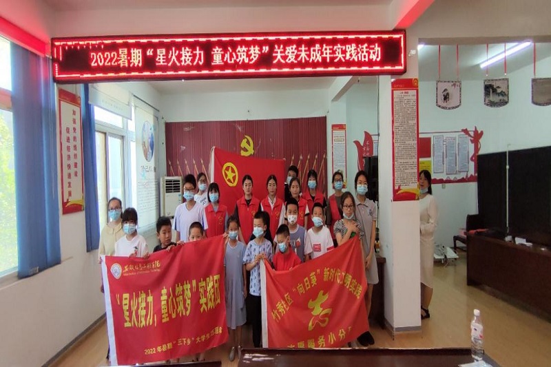 本网讯 当前未成年处于生长发育的关键阶段,为了积极引导未成年人树立正确的价值观念,丰富农村未成年儿童的暑假文化生活,管理工程学院“星火接力,童心筑梦”实践团以学习党史的方式潜移默化的使未成年人树立正确的人生观、价值观、世界观。 7月份,“星火接力,童心筑梦”实践团在芜湖市鸠江区清水社区进行了“星火接力,童心筑梦”实践团授牌与启动仪式。(图为参与人员合影)当天下午,实践团在队长和指导老师的带领下来到了芜湖市鸠江区清水社区。指导老师和清水社区团支部书记进行了“星火接力,童心筑梦”实践团授牌与启动仪式。仪式结束后,清水社区团支部书记以及乡村义教老师对实践团做出重要指示。同时,实践团成员以学习党史的形式对清水社区未成年儿童进行党史教育活动,在党史课上,小朋友们积极主动回答问题,遵守课堂纪律,这对活动的开展起到一定的推动作用,也展现了未成年儿童意气风发的一面。最后,小朋友们以及实践团成员面对国旗齐唱国歌,以此结束当天活动。 (图为签约仪式)(图为授牌仪式)(图为党史实践课)本次活动在实践团队长以及