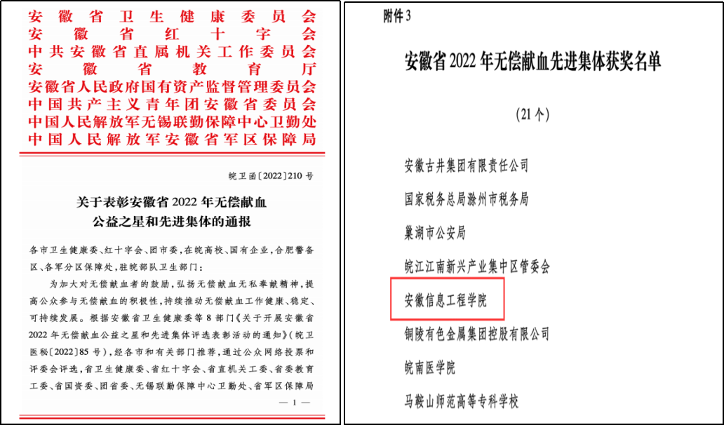 本网讯 近日,由安徽省卫生健康委员会、安徽省红十字会等8部门联合举办的安徽省2022年无偿献血公益之星和先进集体评选落下帷幕,我校荣获“安徽省2022年无偿献血先进集体”荣誉称号,这也是学校首次获得此项荣誉。同时,校青年志愿者协会秦明同学荣获“高校学生无偿献血先进个人入围奖”。(图为学校荣获无偿献血先进集体截图)一直以来,学校对无偿献血工作给予大力支持,校团委积极组织动员师生参与,将无偿献血活动作为提高大学生社会责任意识和青年志愿服务的重点工作。2022年3月1日至4日,校团委组织开展了“雷励锋行·无偿献血”活动,共有750名学生成功参与献血,献血总量184900毫升,参与志愿者289人,累计志愿服务时长1293.96小时,无偿献血量、献血人数、志愿者人数及服务时长均创新高。信工学子们充分展现出“人道、博爱、奉献”的红十字精神,呼吁更多人加入到无偿献血的行列中,以实际行动迎接党的二十大胜利召开。
