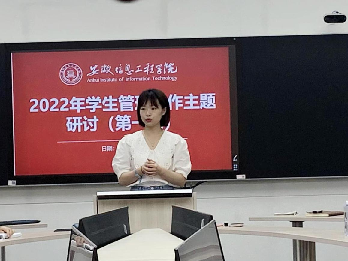 本网讯 孙玉洁,1988年7月出生,2007年12月成为中共预备党员,2016年8月入职安信工,先后担任计算机与软件工程学院专职辅导员、学生处学生管理专员、资助专员,现为学生处学生思想政治教育主管。(图为孙玉洁老师主持辅导员培训现场)身兼数职、全面发展走进孙玉洁老师办公室的时候,她的桌上堆满了工作材料和表格,2022届毕业生刚刚离校,很多后续工作需要进行收尾。孙玉洁根据学校要求,完成了整理、归档等一系列工作,才算是把本学期的工作画上一个圆满的句号。作为学生处学生思想政治教育主管,她的岗位工作是做好学生思想政治教育和辅导员队伍建设,除此之外,她还是机关第一党支部组织委员、校工会女工委员会委员、马克思主义学院兼职思政教师,也是《大学生心理健康教育》授课教师。身兼数职的她,努力在每一个平凡的岗位上,实现个人的全面发展。不忘初心、扎根学工孙玉洁老师入职安信工至今已6个年头,初来学校时,她是计算机与软件工程学院的一名辅导员,是软件工程专业356名学生的知心大姐姐,让她回顾辅导员工作的经历,她这么说
